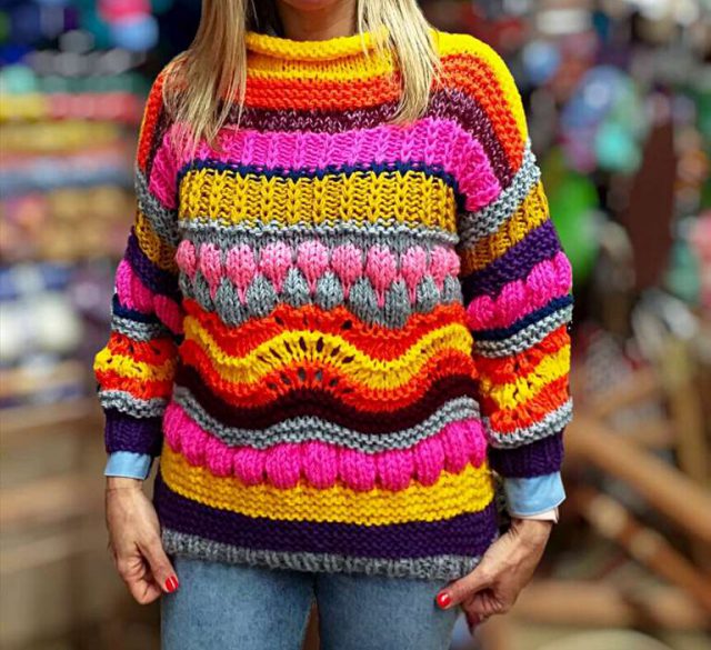 Αυτό το πολύχρωμο ζεστό πουλόβερ πλέχτηκε με πολύ κέφι και έμπνευση! Φούσκες, σχέδιο δαντέλας, garter stitch ,λάστιχο είναι οι βελονιές με σχέδια που χρησιμοποίησα., και ...