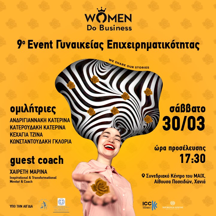 Το Women Do Business, το Σάββατο 30 Μαρτίου 2024, στο ΜΑΙΧ , στην αίθουσα ΠΟΣΕΙΔΩΝ του Διεθνούς Συνεδριακού Κέντρου του Μεσογειακού Αγρονομικού Ινστιτούτου Χανίων , πραγματοποιεί εκδήλωση στις 6 το απόγευμα για την γυναικεία επιχειρηματικότητα.