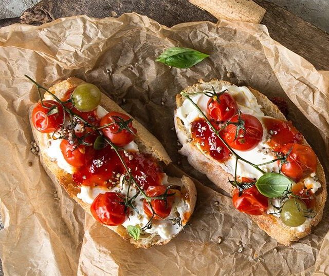 Υλικά 1 μπαγκέτα, κομμένη σε λεπτές φέτες 3 κ. σ. ελαιόλαδο, μοιρασμένο 4 φέτες τυρί μοτσαρέλα 2 φλ. τσαγιού ντοματίνια, κομμένα στη μέση 1 κ. γλ. βαλσάμικο ξύδι 1 σκελί...