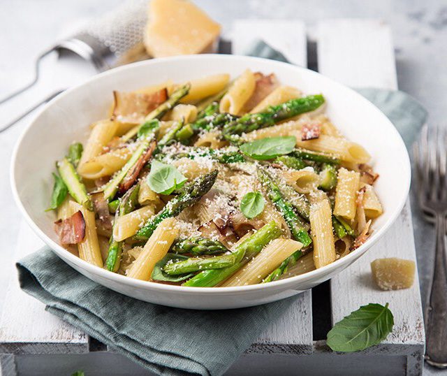 Υλικά 220 γρ. ζυμαρικά 8 λωρίδες φέτες μπέικον άψητο, κομμένο σε κύβους 220 γρ. φρέσκα σπαράγγια, χωρίς τα άκρα και κομμένα σε κομμάτια 5 εκατοστών 1/2 φλ. τσαγιού λευκό ξ...