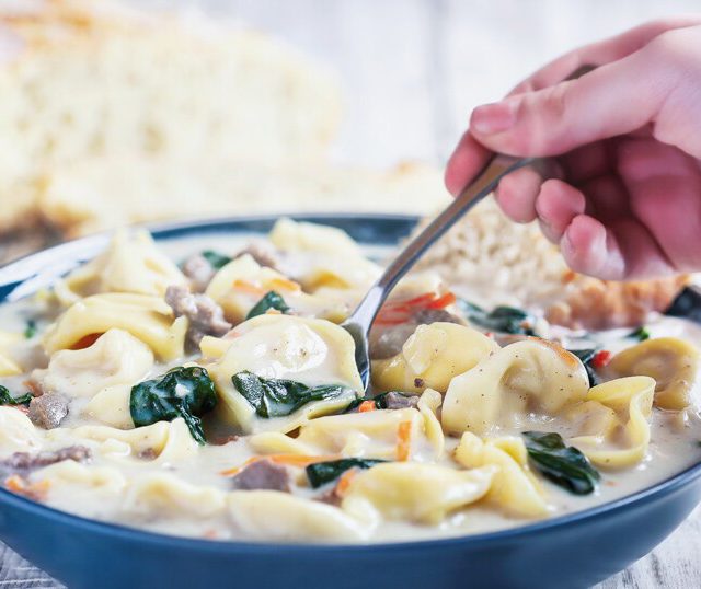 Σούπα με τορτελίνια και κιμά από λουκάνικο