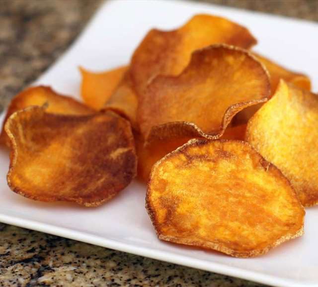 Πεντανόστιμα και υγιεινά. Υλικά 1 μεγάλη γλυκοπατάτα, σε λεπτές φέτες 1 κουταλιά της σούπας ελαιόλαδο ½ κουταλάκι του γλυκού καρυκεύματα (αλάτι, ρίγανη, πάπρικα) Εκ...