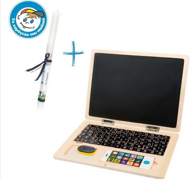 Χειροποίητη λαμπάδα “Με Χαμόγελο” από τους εθελοντές του Χαμόγελου με απλό λευκό κερί και χάρτινη διακόσμηση με σχέδια και ξύλινο λάπτοπ με μαγνητικό μαυροπίνακα...