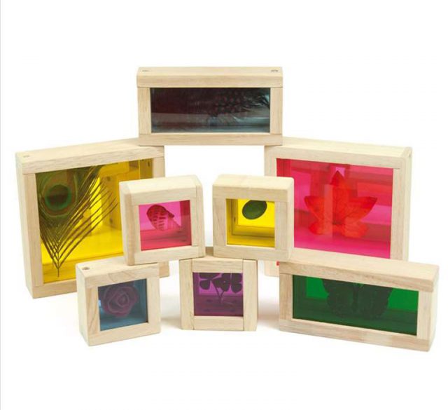 8 τουβλάκια σε 2 διαφορετικά σχήματα με ξύλινα πλαίσια, διαφανή ακρυλικά ένθετα χρώματος και διάφορα υλικά για παρατήρηση στο εσωτερικό τους. Η πίσω πλευρά από τα ...