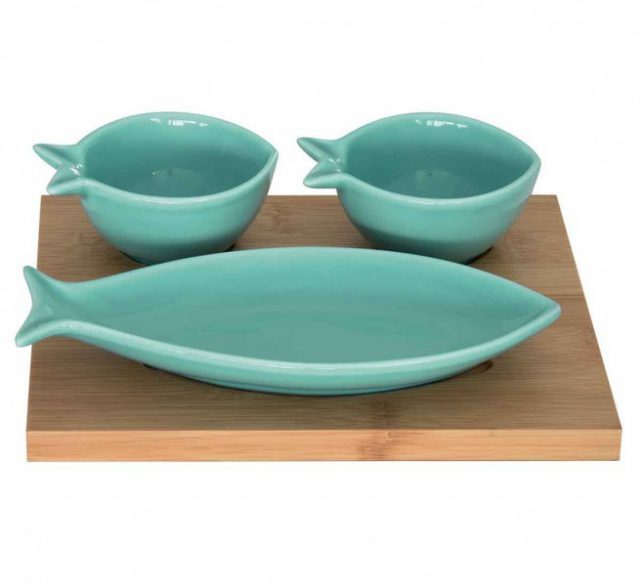 Κατασκευασμένο από πορσελάνη υψηλής ποιότητας. Σε καλοκαιρινό σχέδιο. Μέγεθος: μήκος 19.5cm, πλάτος 16.5cm. Διαθέτει 3 μπολ σε ξύλινη βάση. Ιδανικά για Dip και ξηρούς καρπ...