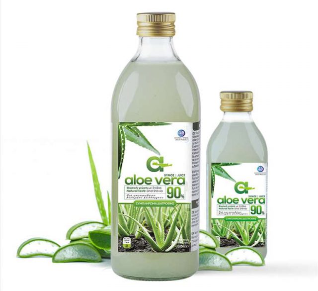 Φυσικός χυμός αλόης με περιεκτικότητα 90% σε γέλη από πιστοποιημένα φυτά ποικιλίας barbadensis miller βιολογικών καλλιεργειών σε γυάλινο μπουκάλι. Χωρίς προσθήκη ζάχαρης,...