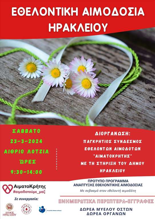 Το Σάββατο 23/03/2024 και θα πραγματοποιηθεί εθελοντική αιμοδοσία στο κέντρο της πόλης του Ηρακλείου και συγκεκριμένα στο αίθριο της Λότζια από τις 9:30 έως τις 14:00.