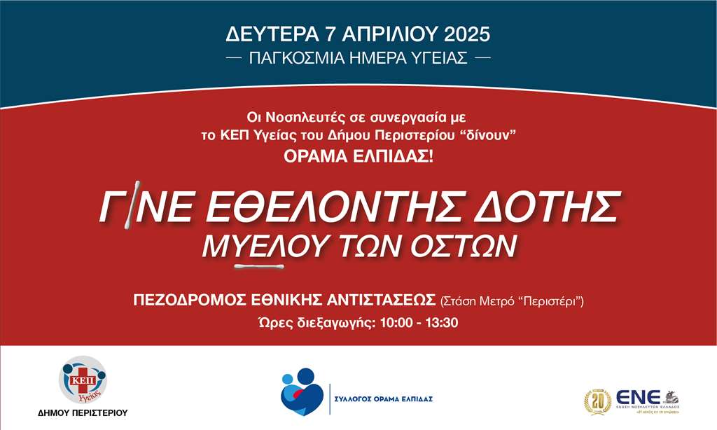 Η Ένωση Νοσηλευτών Ελλάδος σε συνεργασία με το ΚΕΠ Υγείας του Δήμου Περιστερίου και τον Σύλλογο «ΟΡΑΜΑ ΕΛΠΙΔΑΣ», διοργανώνουν ενημερωτική – εθελοντική δράση για την προσέλκυση νέων εθελοντών δοτών μυελού των οστών, για τους δημότες του Περιστερίου, στο πλαίσιο της Παγκόσμιας Ημέρας Υγείας 2025, ώστε όλοι μαζί να δώσουμε ΟΡΑΜΑ ΕΛΠΙΔΑΣ!