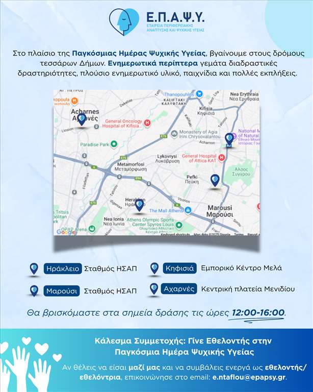 Στο πλαίσιο της Παγκόσμιας Ημέρας Ψυχικής Υγείας (10/10) η Εταιρεία Περιφερειακής Ανάπτυξης και Ψυχικής Υγείας (Ε.Π.Α.Ψ.Υ.) σας προσκαλεί να συμμετάσχετε σε μία ακόμη μοναδική δράση στο κέντρο της Κηφισιάς, με στόχο την ενημέρωση, την ευαισθητοποίηση και την αποδόμηση των στερεοτύπων που περιβάλλουν την ψυχική υγεία.
