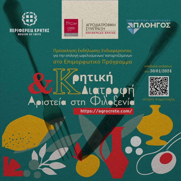 Συνεχίζονται οι αιτήσεις της πρόσκλησης του εκπαιδευτικού προγράμματος «Κρητική Διατροφή και Αριστεία στη Φιλοξενία», που υλοποιεί η Περιφέρεια Κρήτης σε συνεργασία με την Αγροδιατροφική Σύμπραξη και την Εκπαιδευτική Αναπτυξιακή «ΠΛΟΗΓΟΣ».